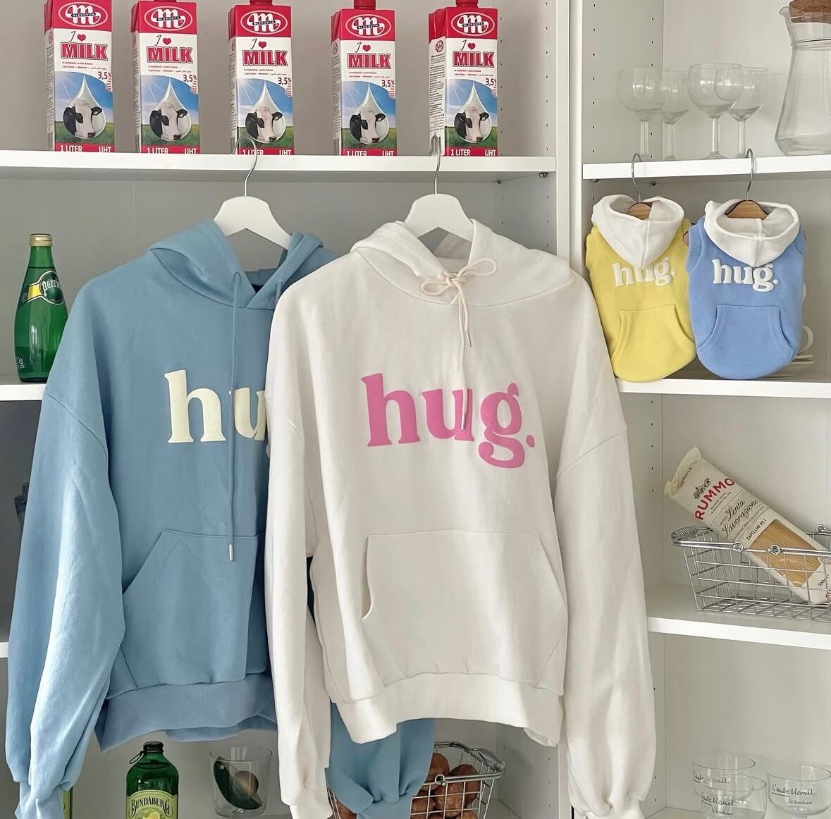 「hug.」の文字がワンポイントのフーディ。