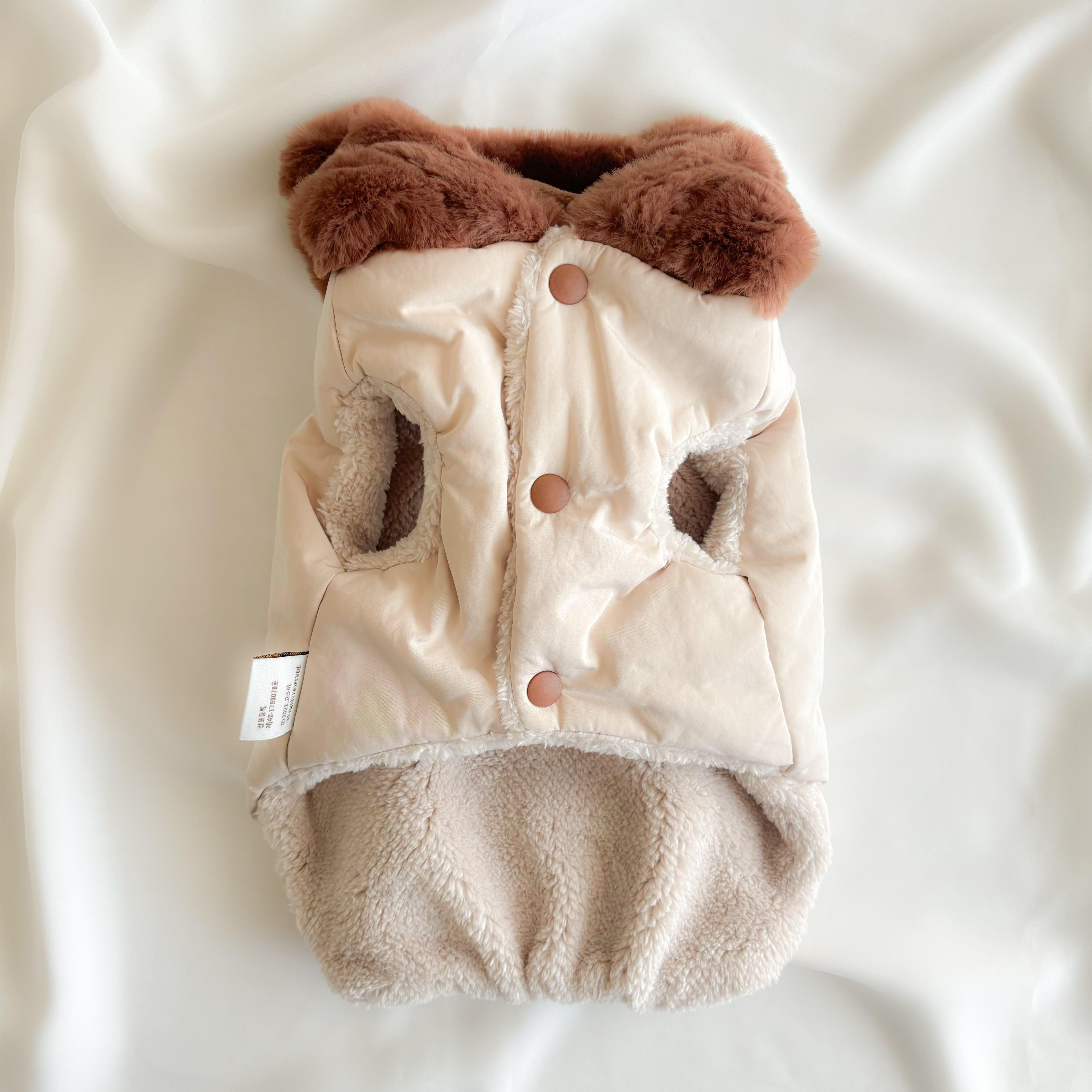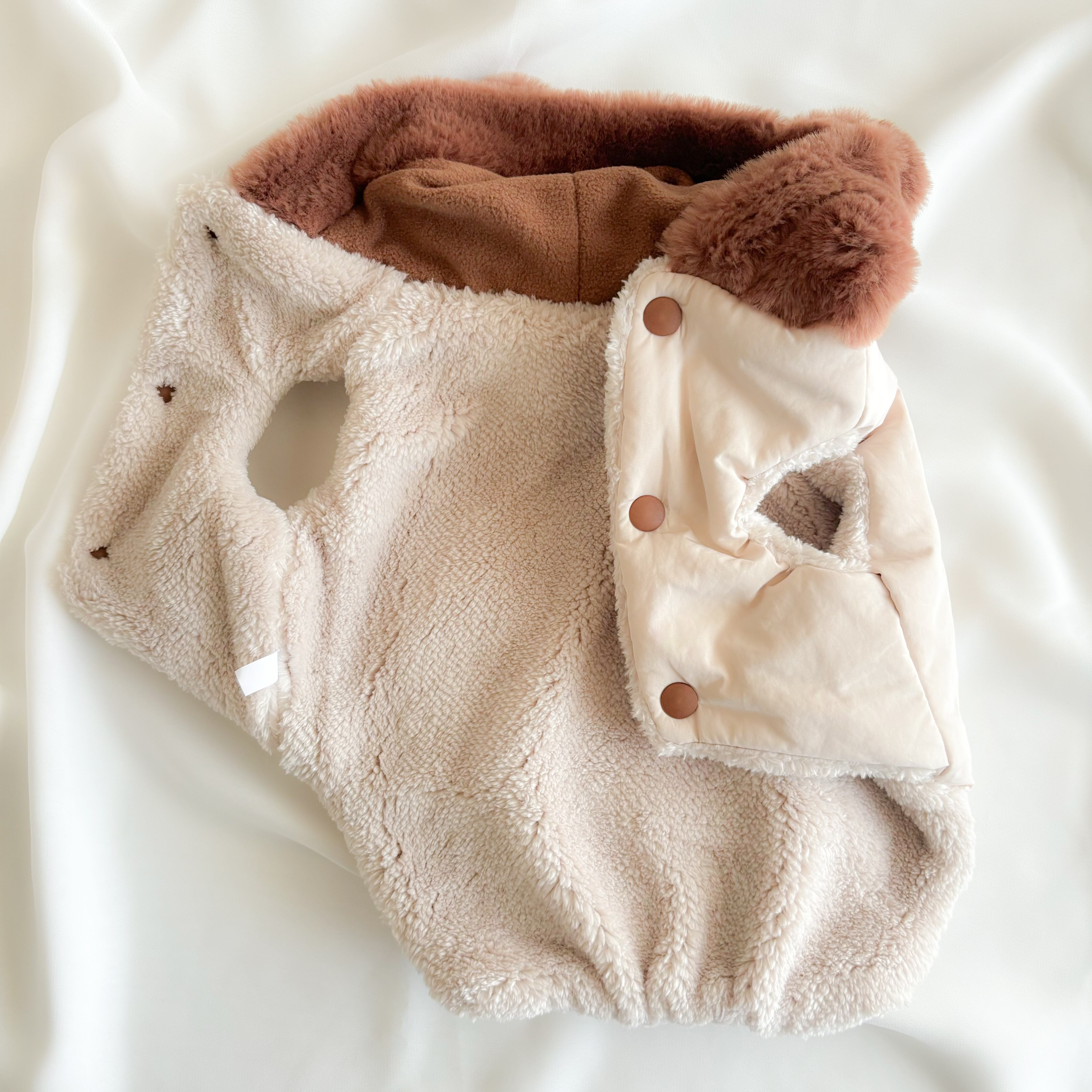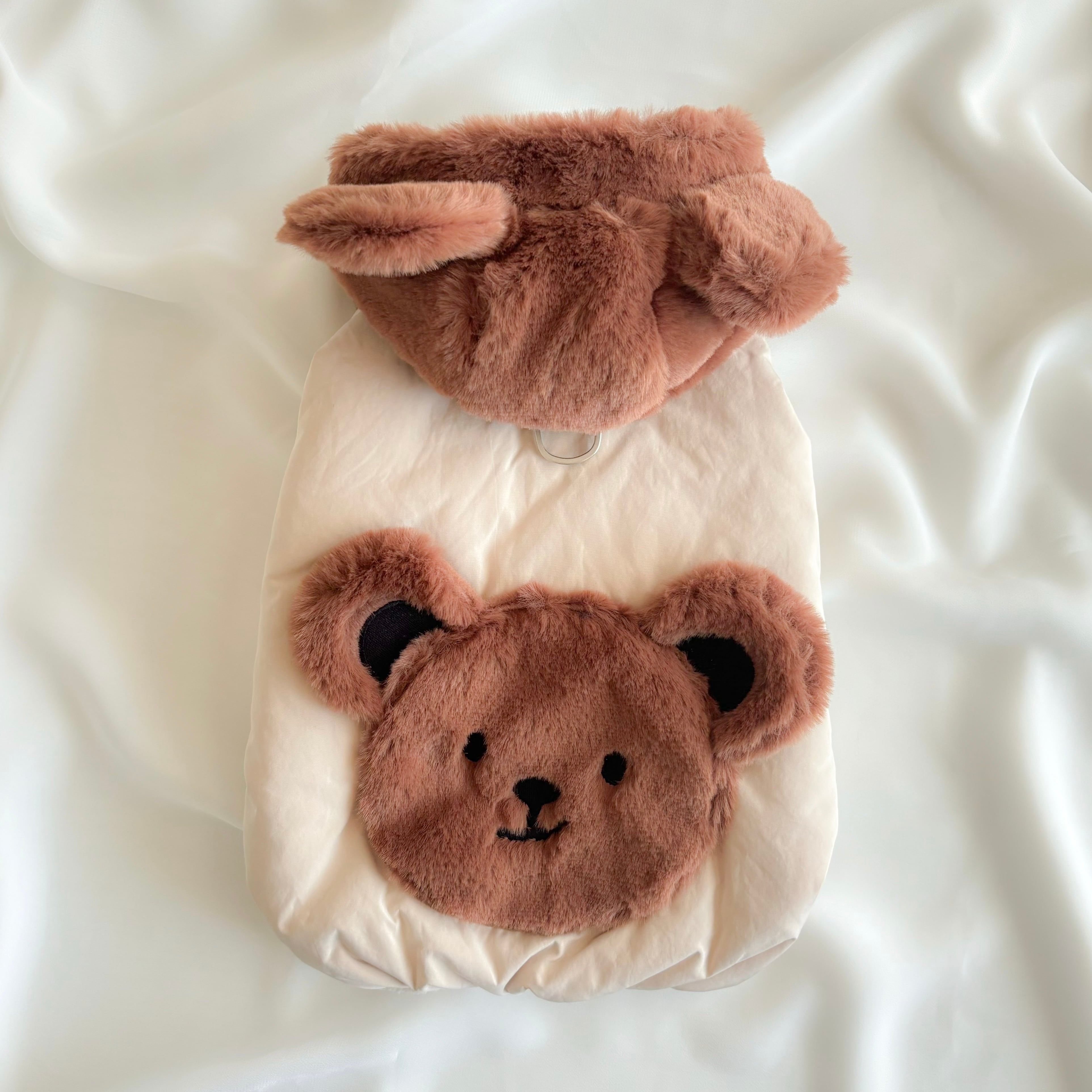 フードと背中のクマちゃんには高級フェイクファー素材が使用されているので、とっても手触りが良いのもポイント!